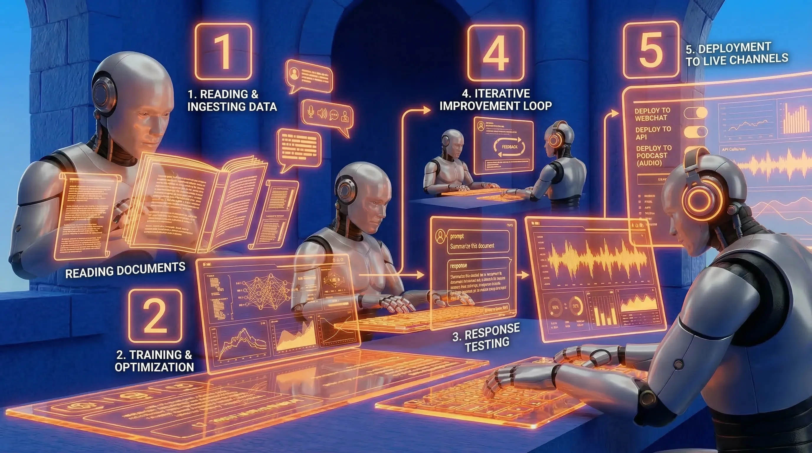 Our AI assistants are powered by large language models fine-tuned on your specific business data. We use retrieval-augmented generation (RAG) to ensure answers are always grounded in your actual documentation, not hallucinated — and the system gets smarter with every conversation.